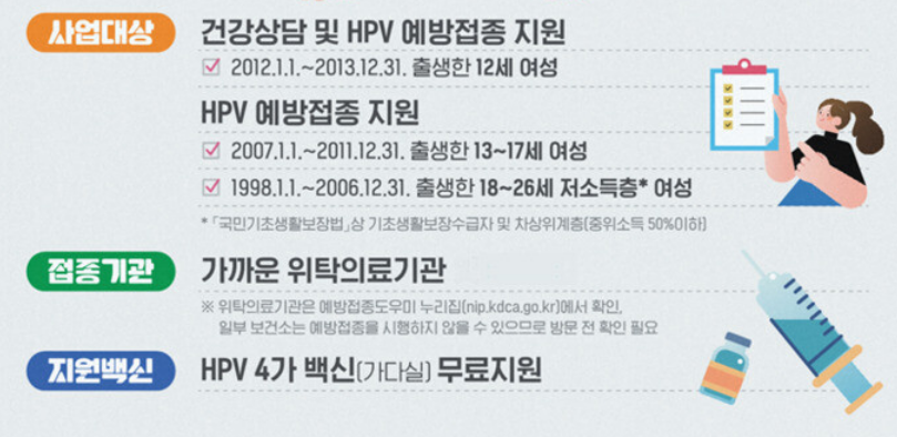 - 접종나이는 12~26세이며, 무료 대상은 청소년과 저소득층 여성입니다.