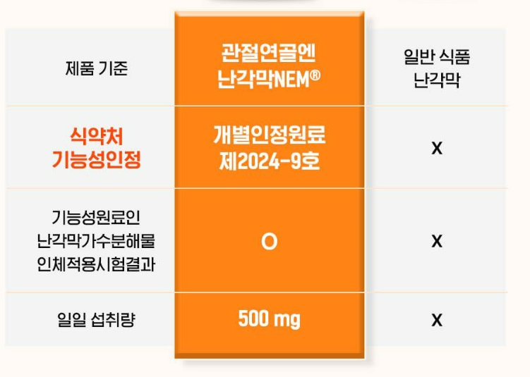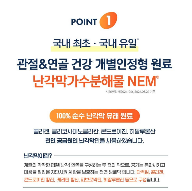 난각막가수분해물(NEM)은 이 모든 성분을 고유의 특성대로 보유하고 있어, 다른 관절 보조제들과 비교해 흡수율이 높고 효과적인 성분으로 인정받고 있습니다.