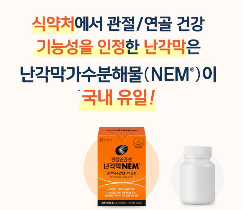 여러 난각막가수분해물(NEM) 제품들이 시중에 나와 있습니다. 그 중 종근당건강의 '관절연골엔 난각막 NEM' 제품은 난각막가수분해물(NEM)을 주성분으로 하여 관절 건강을 지원하는 기능성 영양제로 매우 인기가 높습니다.