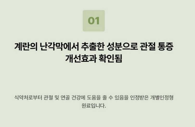 - 난각막가수분해물은 염증을 억제하는 항염 효과가 있습니다. 이는 관절의 염증을 줄여 통증을 완화하고, 전신적인 염증을 감소시킬 수 있습니다.
