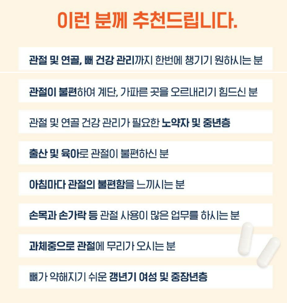 - 관절 건강에 신경 쓰는 사람들: 장기적으로 관절 건강을 유지하고 싶거나, 관절의 퇴행을 예방하고 싶은 사람들에게 매우 유용한 성분입니다.