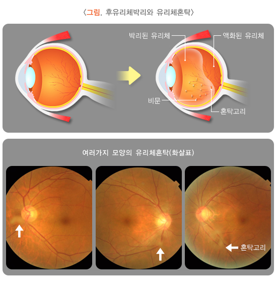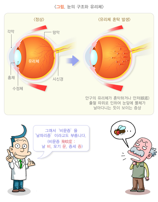 - 유리체 혼탁은 날파리증의 직접적 원인입니다.